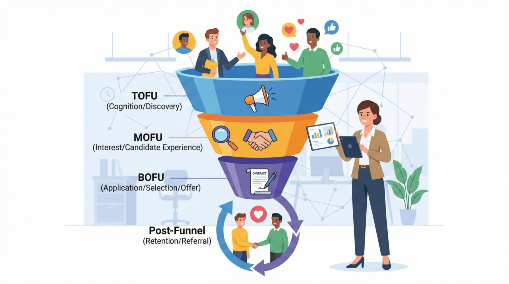| Post-Funnel(入社後) | 入社者・既存社員 | 定着・エンゲージメント向上 | オンボーディング、リファラル制度、アルムナイネットワーク |