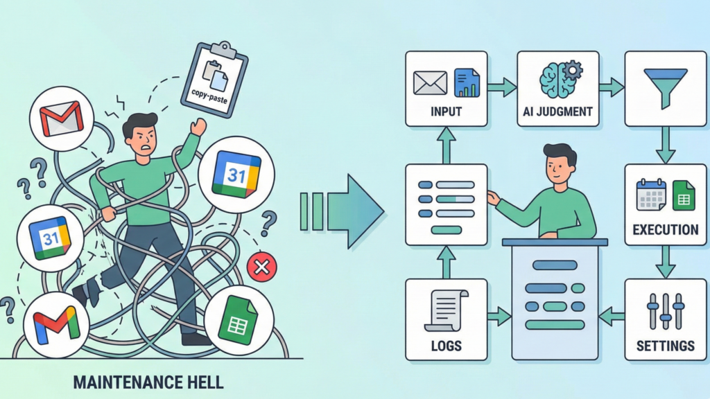 自動化×AI:部品コピペで始めて、保守地獄に落ちない設計原則(Gmail・カレンダー・スプレッドシート運用に効く)