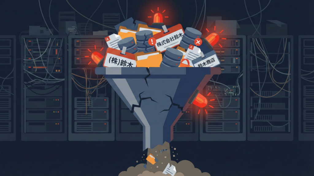 Aさんが検索したのは「鈴木商店」だったが、システムはこれらを「すべて別の会社」として認識していた。その結果、過去の商談履歴、クレーム対応の記録、納品データが、4つの別々のレコードに分散してしまっていたのである。
