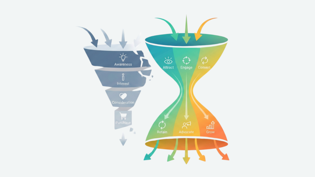 間違っているのは、「ファネルを捨てればいい」という短絡的な解釈です。新規顧客を獲得するプロセスは依然として必要であり、ファネル的な考え方が完全に無効になったわけではありません。