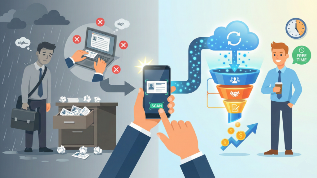 苦労して集めた名刺も、机の引き出しに入れた瞬間、それは単なる紙切れになります。紙の状態では検索することも、何かあったときに通知を受けることもできないからです。「あの案件のキーマンは誰だったか」と思い出そうとして、大量の名刺の束から一枚を探し出すのに5分かかる。メールを送ろうとしてアドレスを手打ちするのに3分かかる。この小さなタイムロスが積み重なって、あなたの残業時間を形成しているのです。