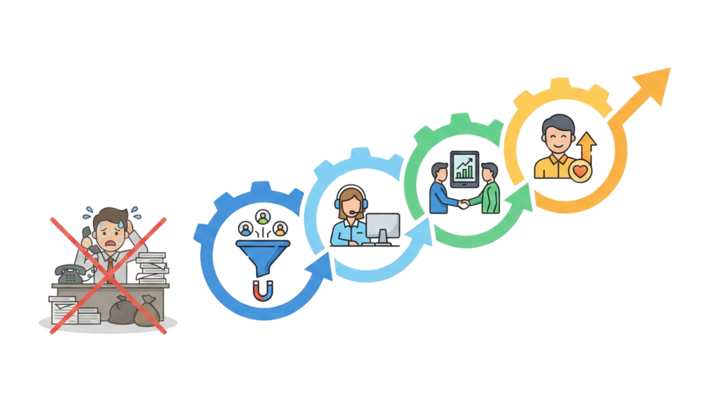 かつての日本の営業スタイルを思い浮かべてみてください。一人の担当者がリスト作成からテレアポ、商談、クロージング、そして納品後のサポートまでを一貫して担う。いわゆる「属人型」の営業です。